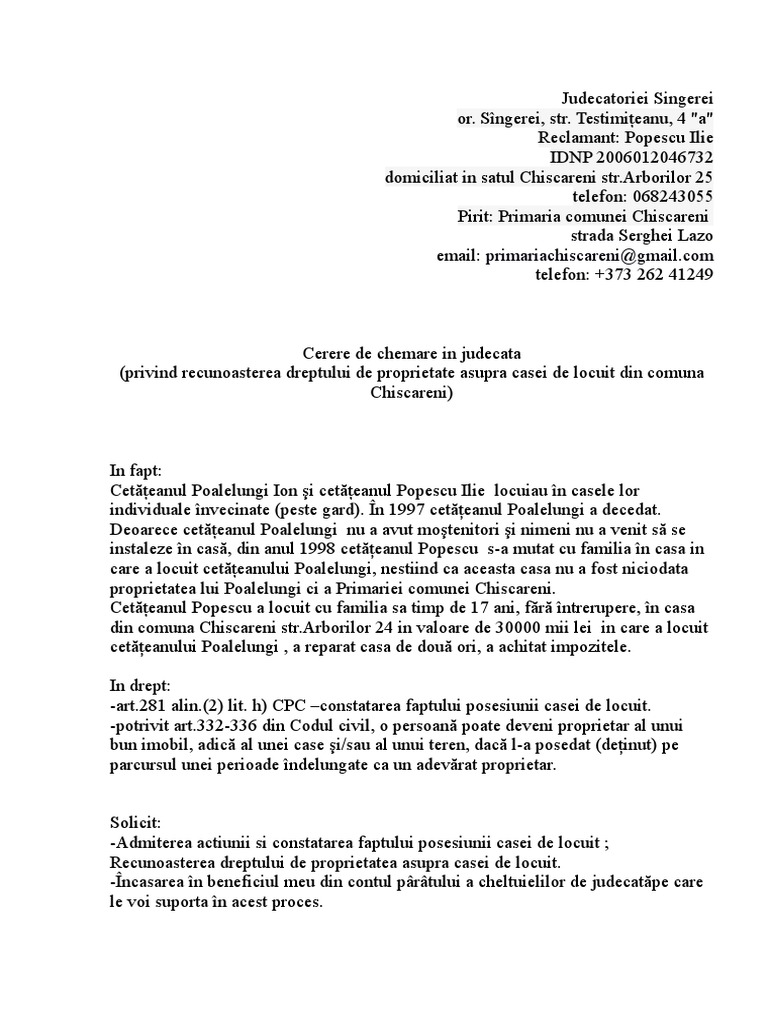 A) numele şi prenumele, domiciliul sau reşedinńa părńilor ori, pentru persoane juridice, denumirea şi sediul lor. Понедельник, 20 мая 2019 г. Însă în cazul în care nu vă permiteți serviciile unui asemenea specialist, puteți întocmi cererea de.